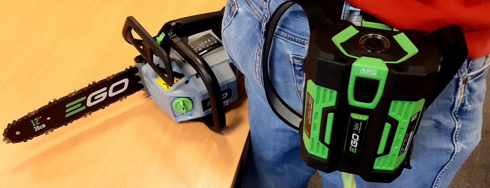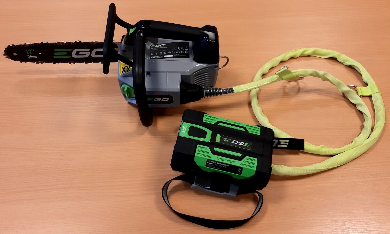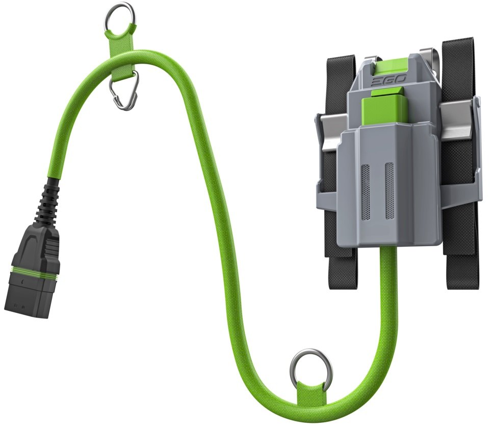 K pile je dodáván i velmi komfortní a praktický nosič baterie, který je opatřen bezpečnostním závěsovým lanem a napájecím kabelem v jednom. Toto bezpečnostní lano je opatřeno několika oky pro zavěšení pily za závěsný držák na temeni těla pily během práce ve výšce nebo v koruně stromu. Nosič baterie si pracovník zavěsí na pracovní lezecký postroj a ten mu při práci nikde nepřekáží a ani nepocítí hmotnost napájecí baterie. Ideálním napájením pily EGO CSX3000E je nová lithiová baterie EGO Power+ 56V Arc BA2240T - rovněž novinka roku 2021, s kapacitou 4,0Ah a sníženou hmotností. Nicméně lze použít jakékoliv další baterie z nabídky EGO a např. výše uvedená 4Ah baterie BA2240T vám umožní uskutečnit až 200 řezů a např. baterie 2,5Ah vám umožní uskutečnit až 130 řezů. Naše lithiové baterie EGO Power+ 56V Arc Vám poskytnou, dostatek energie pro pohon dostatečně výkonného a účinného bezuhlíkového elektromotoru s přímým náhonem na řetězku.