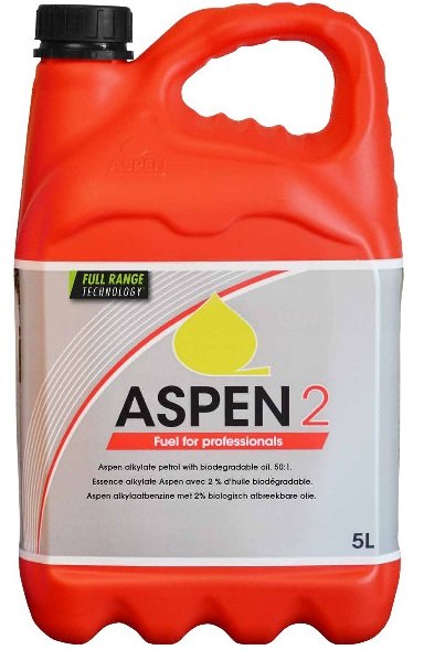 Alkylátový benzín Aspen 2 obsahující 2 % biologicky odbouratelného oleje pro dvoutaktní motory, který je vhodný pro řetězové pily, křovinořezy, nůžky na živý plot, mopedy, vyžínače trávy, elektrické řezačky a jiné dvoutaktní motory.