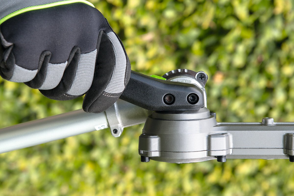 Pro kvalitní úpravu a precizní tvarování vysokých živých plotů a okrasných dřevin v okrasných zahradách, zámeckých parcích ale i doma na zahradě je důležitý čistý a přesný střih, kterým rostlinu nepoškodíte, nezraníte a rostlina tak po zastřižení zůstává zdravá a svěží. To lze provádět v bezpečí stabilního postoje na pevné zemi. Proto je zde k dispozici nástavec s nůžkami na živý plot s dlouhým nástavcem a přesnou, 51cm dlouhou oboustrannou lištou, přesně broušenou pomocí diamantového nástroje. Pohodlné manipulaci při práci přispívá rovněž otočný kloub lišty. Úhel sklonu lišty do 12 různých poloh je velmi důležitý, aby se přizpůsobil příslušné práci na konkrétním porostu a usnadnil také uskladnění v malých prostorách. Mimořádně ostré střižné zuby mají rozteč 26mm jsou schopny ustřihnout dřevinu do průměru až 15 mm. Celková délka nástavce je 160cm, ve složeném stavu 99cm. Pohonná jednotka v kombinaci s tímto nástavcem je plnohodnotnými nůžkami na živé ploty s mimořádně velkým dosahem.