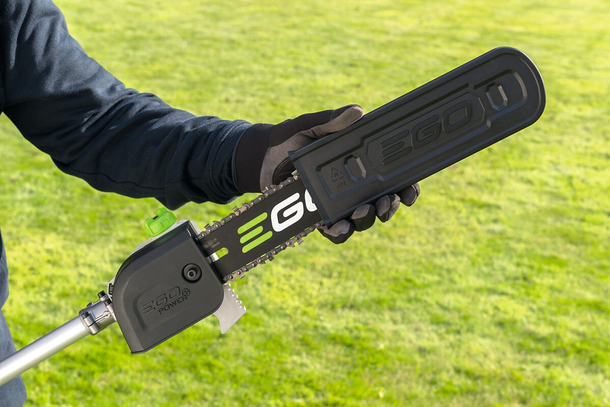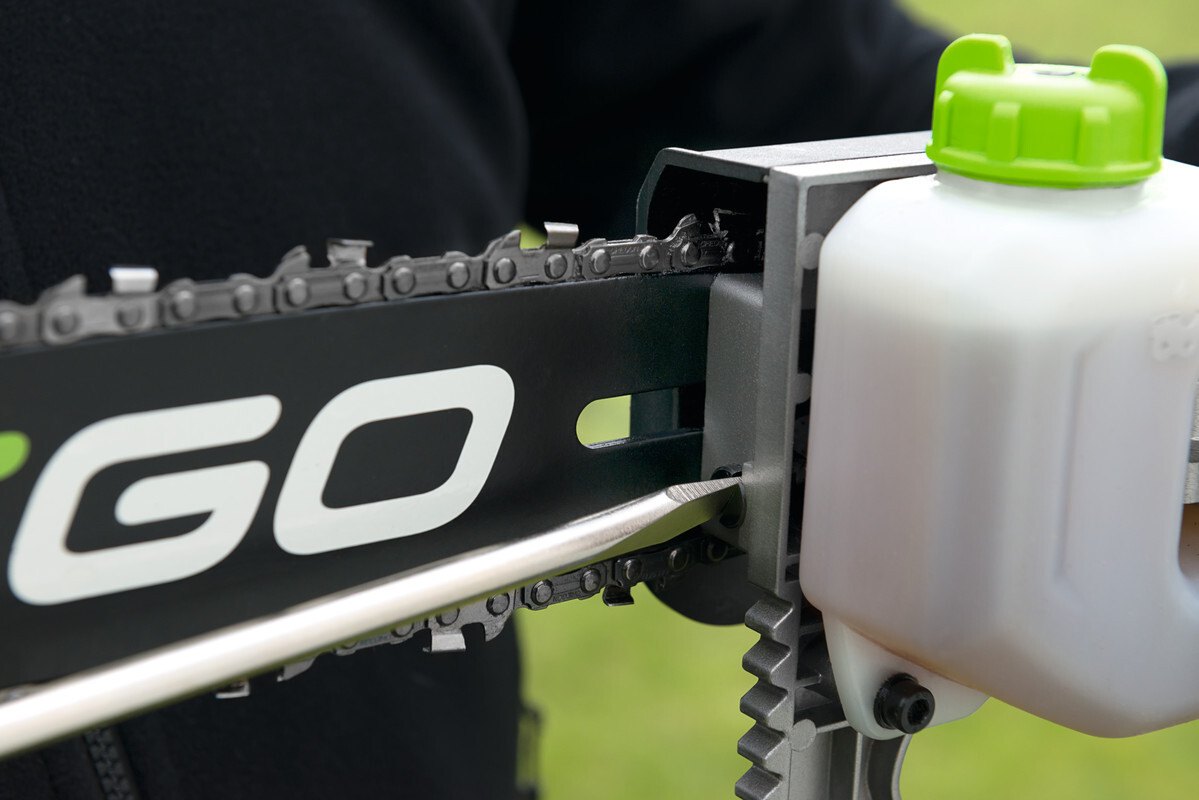 Pro zařezávání a odstraňování větví ve výšce koruny stromů je k dispozici 142 cm dlouhý nástavec s prořezávací řetězovou pilou s vodící lištou 25 cm. Jako řezný nástroj zde slouží řetízek 90PX 3/8"-1,1 - 40 článků. Výkon a stabilní kroutící moment 56V, bezuhlíkového elektromotoru v pohonné jednotce bohatě pokrývá požadavky řezného výkonu řetězové pily s délkou vodící lišty 25 cm. Řezná rychlost řetězu stačí na úpravu, odstraňování či zarovnávání větví koruny stromů bez potřeby žebříku či podobných zařízení při bezpečném a stabilním postoji přímo ze země. Rozšíření dosahu pily do ještě větší výšky získáte při použití prodlužovacího nástavce EP7501 z uhlíkových vláken v délce 78cm.