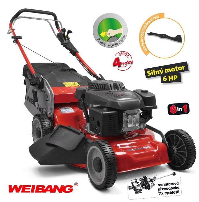 Velkou předností této sekačky je variabilnost použití funkcí 6 in 1, což znamená, že sekačka WEIBANG WB 506 SCV 6in1 umí sbírat posečenou trávu do koše, mulčuje, vyhazuje trávu bokem, zadním deflektorem a má variabilní pojezd daný 7 rychlostní variátorovou převodovkou. Výhoda silného motoru o výkonu 6 HP a nože s velkými lopatami Vám perfektně sebere i přerostlou mokrou trávu.