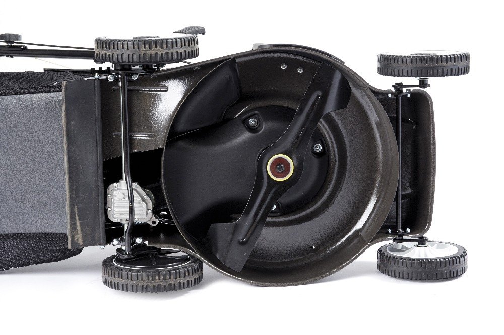 Pogumovaná sendvičová kola jsou uložena v oboustranných kuličkových ložiscích, centrální nastavení výšky sečení je u této značky samozřejmostí. Velkým nadstandardem u této sekačky je použita speciální třecí spojka na noži sekačky pod unášečem, která je schopna prokluzu nože při naražení do pevné překážky. Tato funkce může eliminovat škody na sekačce způsobené nárazem nože do překážky. Ergonomická rukojeť s ovládacími prvky otáček motoru a speciální povlak na obvodu sběracího koše, který stimuluje proud vzduchu, aby se neprášilo na obsluhu.