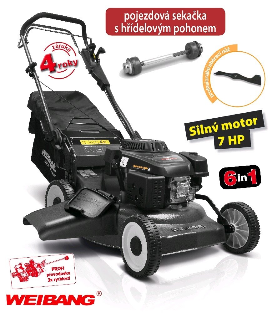 Sekačka WEIBANG WB 537 SCV 6in1 je určena na velké travnaté plochy a pro středně i pro těžké profesionální nasazení. Její neskutečná výbava, design a kvalitní zpracování z ní dělají doslova perlu v této profesionální vyšší třídě travních sekaček s pojezdem. Sekačka WEIBANG WB 537 SCV 6in1 vyniká speciálním pevným a masivním ocelovým šasim. Velkou předností této sekačky je variabilnost použití mnoha funkcí 6in1, což znamená, že sekačka WEIBANG WB 537 SCV 6in1 umí sbírat posečenou i mokrou trávu do koše, bočním výhozem, mulčovat i zadním deflektorem a má variabilní pojezd daný profesionální 3-rychlostní kovovou převodovkou. Výhoda silného motoru WEIBANG o super výkonu 7 HP a nože s velkými lopatami Vám perfektně sebere i přerostlou mokrou trávu. Pogumovaná sendvičová kola jsou uložena v oboustranných kuličkových ložiscích, centrální nastavení výšky sečení je u této značky samozřejmostí.