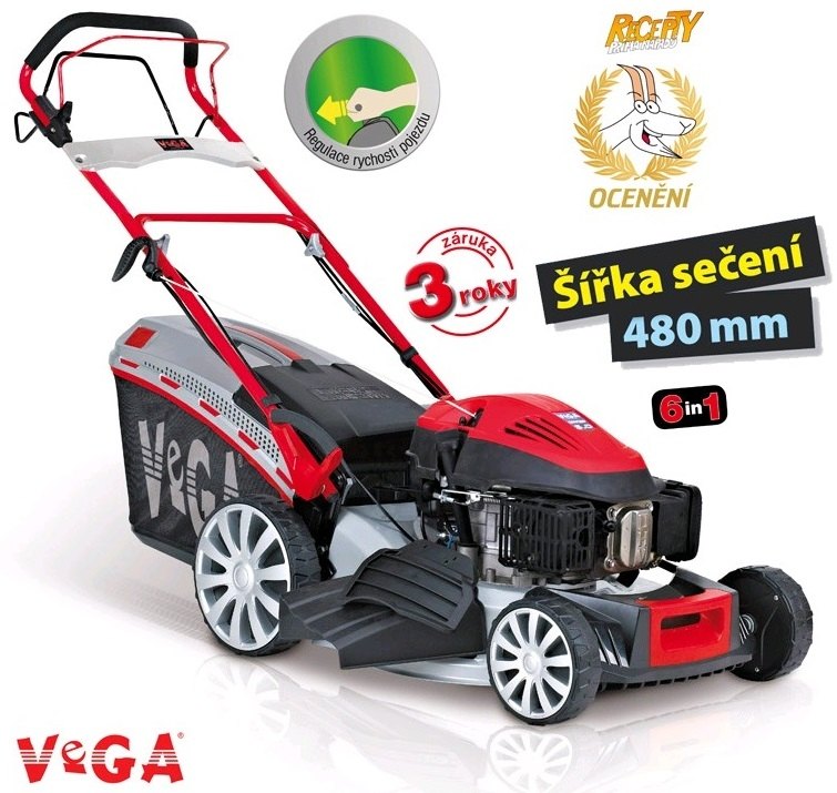 Zahradní sekačka je vybavena robustním ocelovým skeletem se záběrem sečení 48 cm. Motorová sekačka je poháněna čtyřtaktním motorem VeGA OHV o výkonu 5 Hp. Velkou předností této sekačky je variabilnost použití 6 in 1, což znamená, že sekačka umí sbírat posekanou trávu do koše, mulčuje, a nebo může vyhazovat trávu bočním deflektorem i zadním deflektorem ven. Tyto poslední funkce se používají převážně na přerostlou trávu. Další předností je možnost variabilní změny rychlosti sekačky díky níž můžete pohodlně nastavit rychlost sečení podle aktuálních sekacích podmínek. Rychlost motorové sekačky je možné regulovat v rozmezí 3 - 4 km/hod.