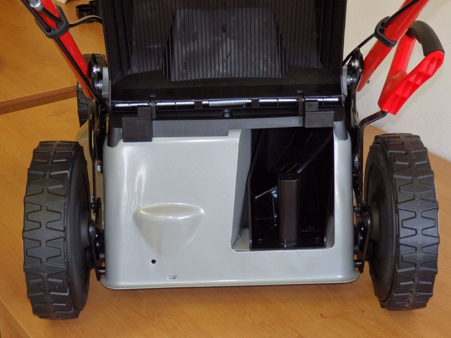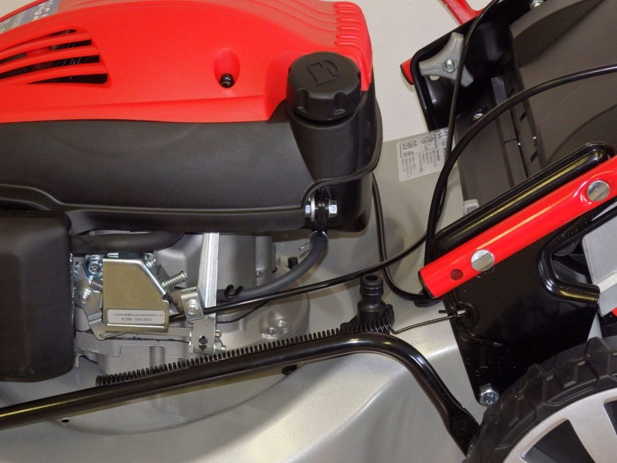 V extrémních podmínkách je možné otevřít kryt na straně šasi a nasadit deflektor bočního výhozu. Je to obzvláště efektivní, pokud máte vysokou, mokrou trávu. Výšku střihu trávníku můžete pohodlně zvolit pomocí samostatné páky centrálního nastavení výšky.