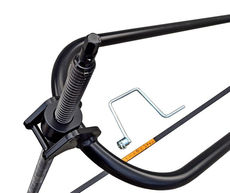 Tímto typem zvedáku se zahradní traktor nakloní na stranu. Zdvihání zajišťuje vysokopevnostní šroub a matice. Místo kliky lze použít utahovačku, popřípadě akuvrtačku. Boční strana traktoru je vyzdvižena do výše 75 cm.