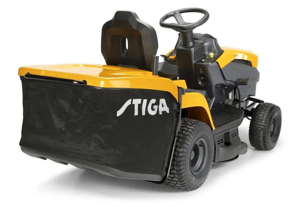 Zahradní traktor s motorem STIGA o objemu 432 cm³ s žacím ústrojím o šířce 84 cm se dvěma noži a zadním sběrným košem na trávu o objemu 240 l.