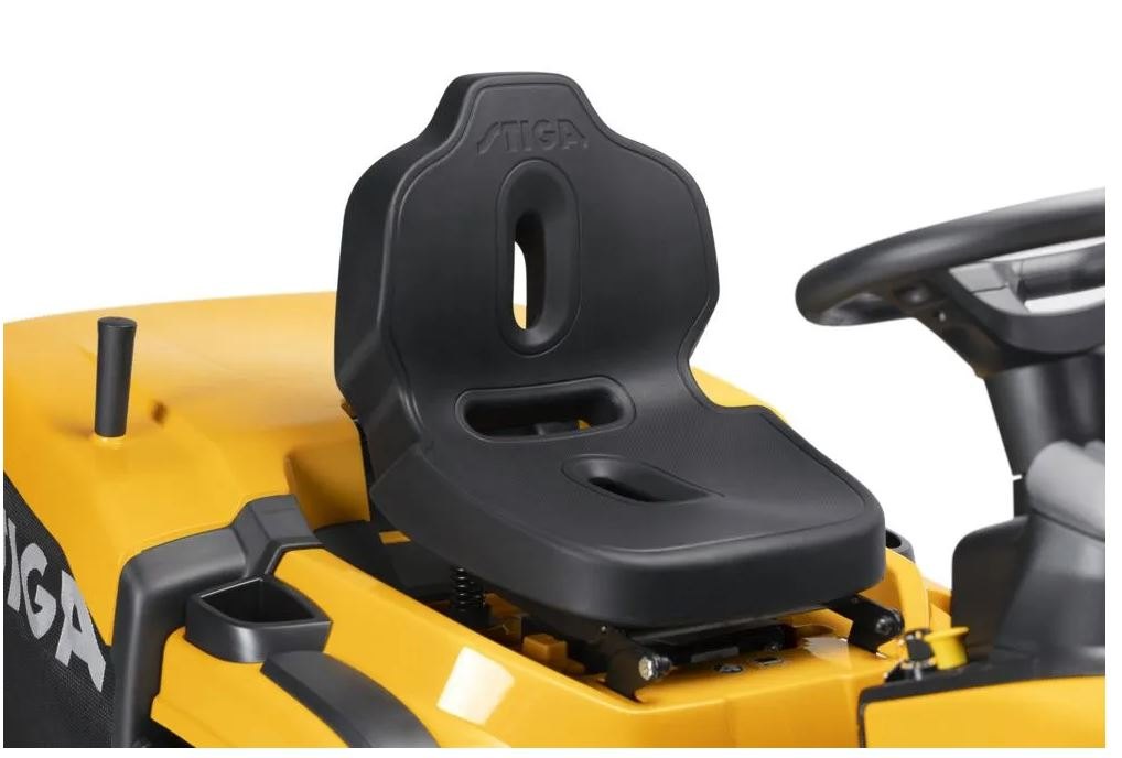 Traktor STIGA Estate 384 s pojezdem je vybaven hydrostatickou převodovkou ovládanou pedálem, která umožňuje plynulé řízení rychlosti vpřed bez nutnosti řazení. Žací ústrojí o záběru 84 cm má dva nože a 7 nastavení výšky sečení v rozmezí od 25 do 80 mm a pohodlnou elektromagnetickou spojku zapínání nožů, která se ovládá tlačítkem. Model Estate 384 se může pochlubit zadním sběrným košem na trávu o objemu 240 litrů a lze jej také použít s funkcí STIGA Multiclip pro mulčování. Zvýšený volant umožňuje ergonomickou a pohodlnou jízdu. Nabíječka akumulátoru a mulčovací sada se prodávají samostatně. Ergonomický volant STIGA spolupracuje s nastavitelným sedadlem STIGA Classic s vysokým opěradlem, takže jízda s ním je potěšením. Mulčovací sada a závěs pro přívěs jsou součástí dodávky, nabíječka baterií se prodává samostatně.