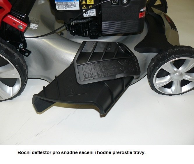 V extrémních podmínkách je možné otevřít kryt na straně šasi a nasadit deflektor bočního výhozu. Je to obzvláště efektivní, pokud máte vysokou, mokrou trávu. Výšku střihu trávníku můžete pohodlně zvolit pomocí samostatné páky centrálního nastavení výšky.