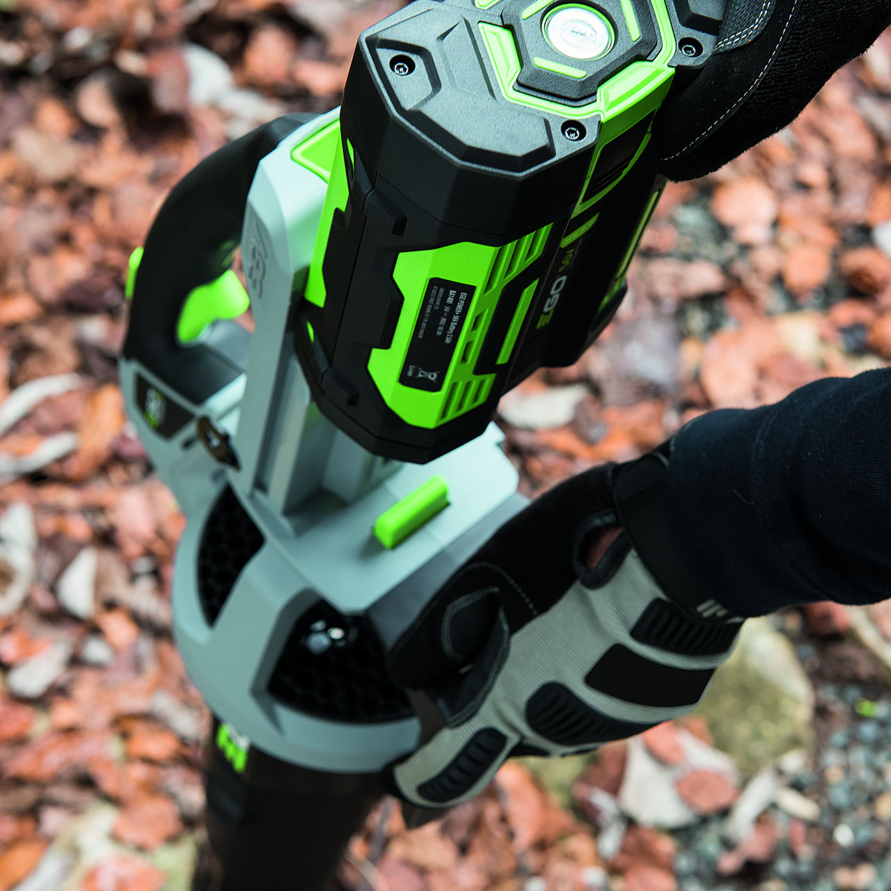 Madlo držení je opatřeno bezpečnostní pojistkou, která v případě uvolnění okamžité vypnutí stroje. Na rukojeti je umístněn vypínač, který zajišťuje při stisknutí plynulé a postupné spuštění stroje a čelo rukojeti je opatřeno ovladačem variabilního ovládání rychlosti. V horní části rukojeti je v dosahu prstu umístěno tlačítko "BOOST". Díky p říjemné ovládácí rukojeti potažené měkčenou gumou, je držení fukaru při práci velmi stabilní, bezpečné a pohodlné. Na pohon fukaru lze použít jakoukoliv baterii ze sortimentu EGO a např. baterie 2,5Ah vám umožní pracovat nepřetržitě od 10 min v režimu "BOST" až do 75 minut v nízkém režimu. Naše lithiové baterie EGO Power+ 56V Arc Vám poskytnou dostatek energie pro pohon dostatečně výkonného a účinného bezuhlíkového elektromotoru s přímým náhonem na turbínu. Stroj je mimořádně tichý a sousedé Vás při práci ani neuslyší. Žádná napájecí šňůra, žádné provozní náplně, žádný hluk, žádný zápach. Nízká hmotnost, pohodlný úchop a snadná manipulace dělají z tohoto stroje vynikajícího pomocníka jak do domácnosti, tak i do firmy.